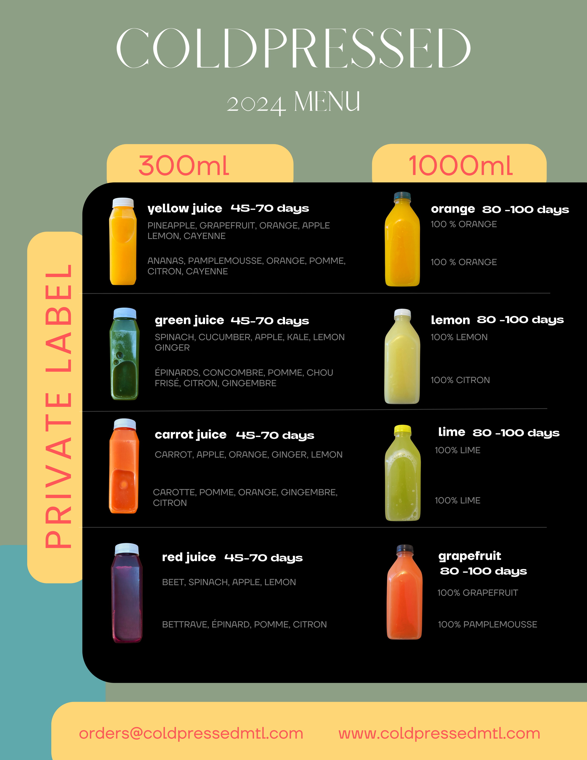 Sans minimums, sans tracas et sans gâchis. Notre programme de marque privée est conçu pour toute entreprise souhaitant se lancer dans l'espace bien-être sans drame. Créez simplement et envoyez vos étiquettes à notre boutique et nous nous occuperons du reste. Pressage, jus, mise en bouteille, étiquetage, livraison. Pas de minimum ni de frais de démarrage. Remplissez le formulaire de soumission et nous vous répondrons !